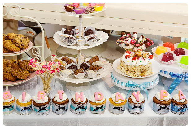 쿠키는 알파벳 모양으로 구어서 아이싱 하고 예쁜 리본으로 장식한 머핀위에 생크림을 두른후 올렸다. 케익뒤에 머시멜로우는 초콜렛을 입인후 핀셋으로 한땀 한땀 ;;;;; 별모양을 수놓은 것.